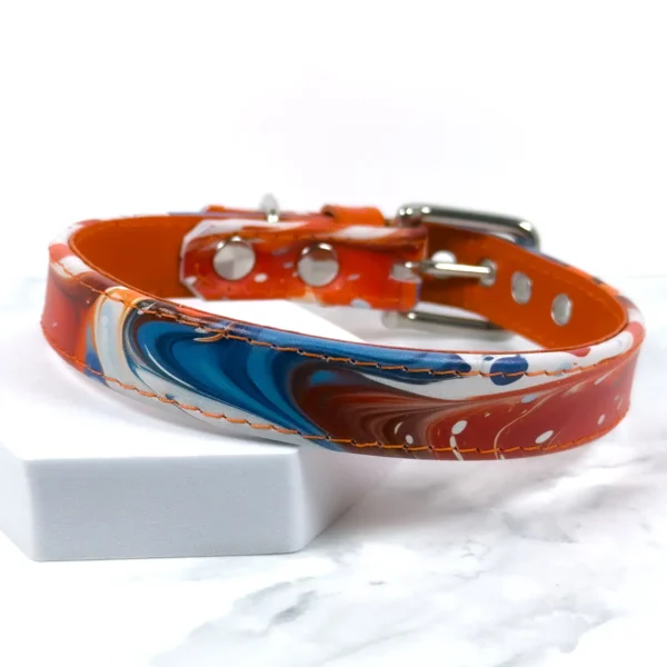 Very. The durability of a printed leather collar comes down to two things: the quality of the leather and the printing method. Ours are made from Italian calf leather sourced from Tuscan tanneries, the same leather we have used for every collar we have made since 2009, and the designs are UV printed rather than painted or applied as a surface coating. UV ink cures as it is applied, bonding directly to the leather and becoming part of it rather than sitting on top of it. The flexible nature of the ink also means it moves with the leather as the collar bends, which is exactly what you want from something your dog wears every day.