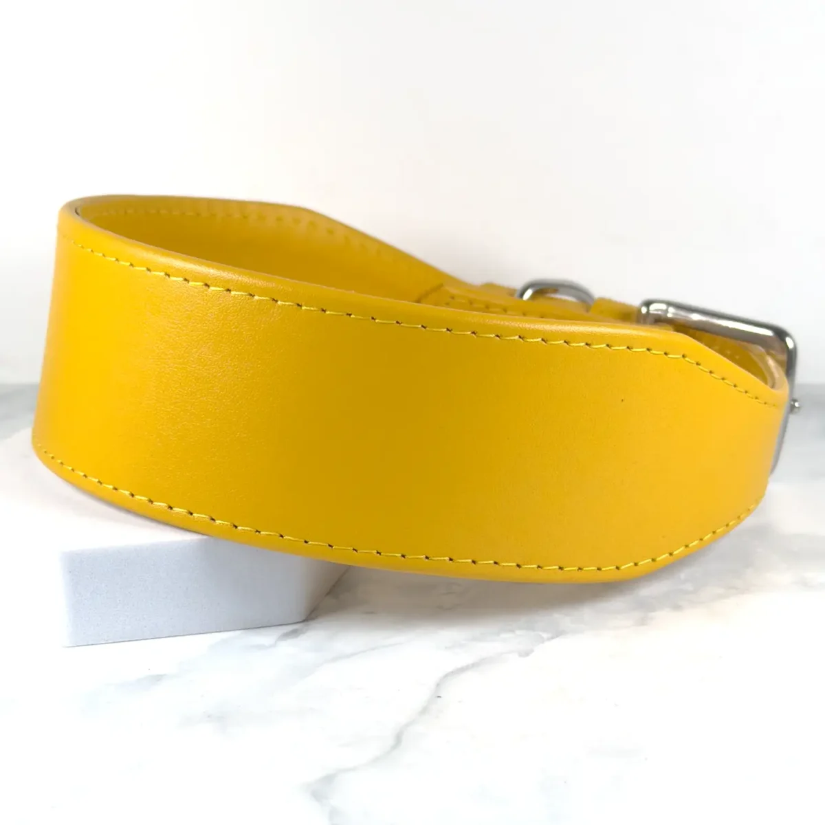 The collar is 2″ wide and narrows to a 1″ buckle and d ring. It will fit a larger sighthound with a neck size between 16″-18″ and is a total length of 20.5″.