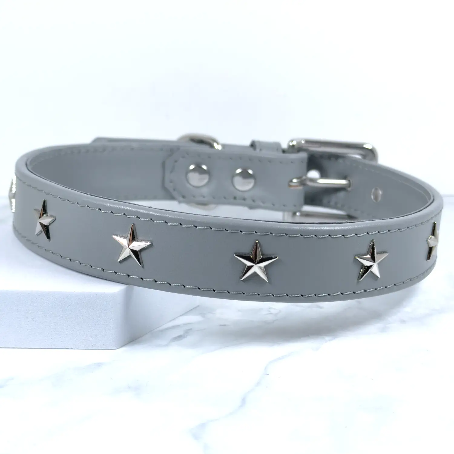 A dog collar made in dove grey leather with a row of silver star-shaped studs, then fitted with a stainless steel buckle.