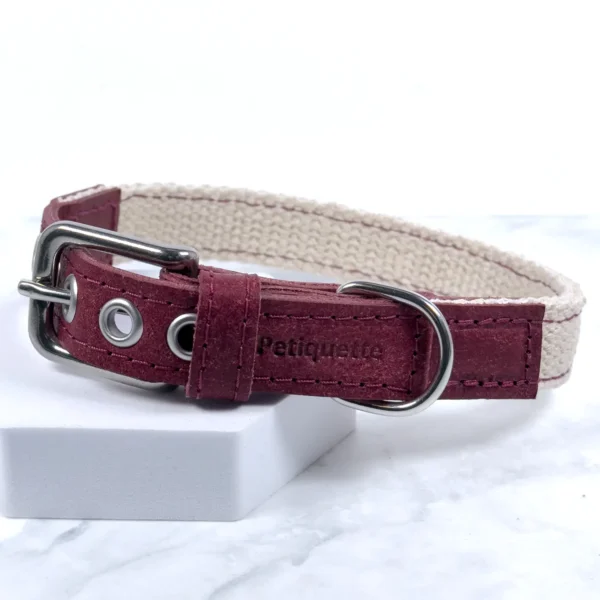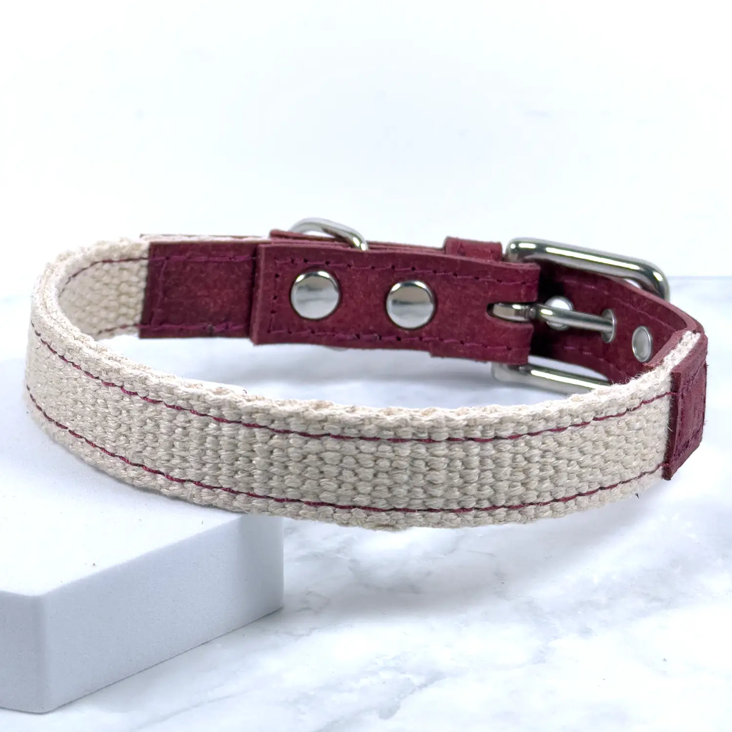 A stylish dog collar made with natural hemp webbing and finished with luxurious, burgundy vegetable tanned leather.