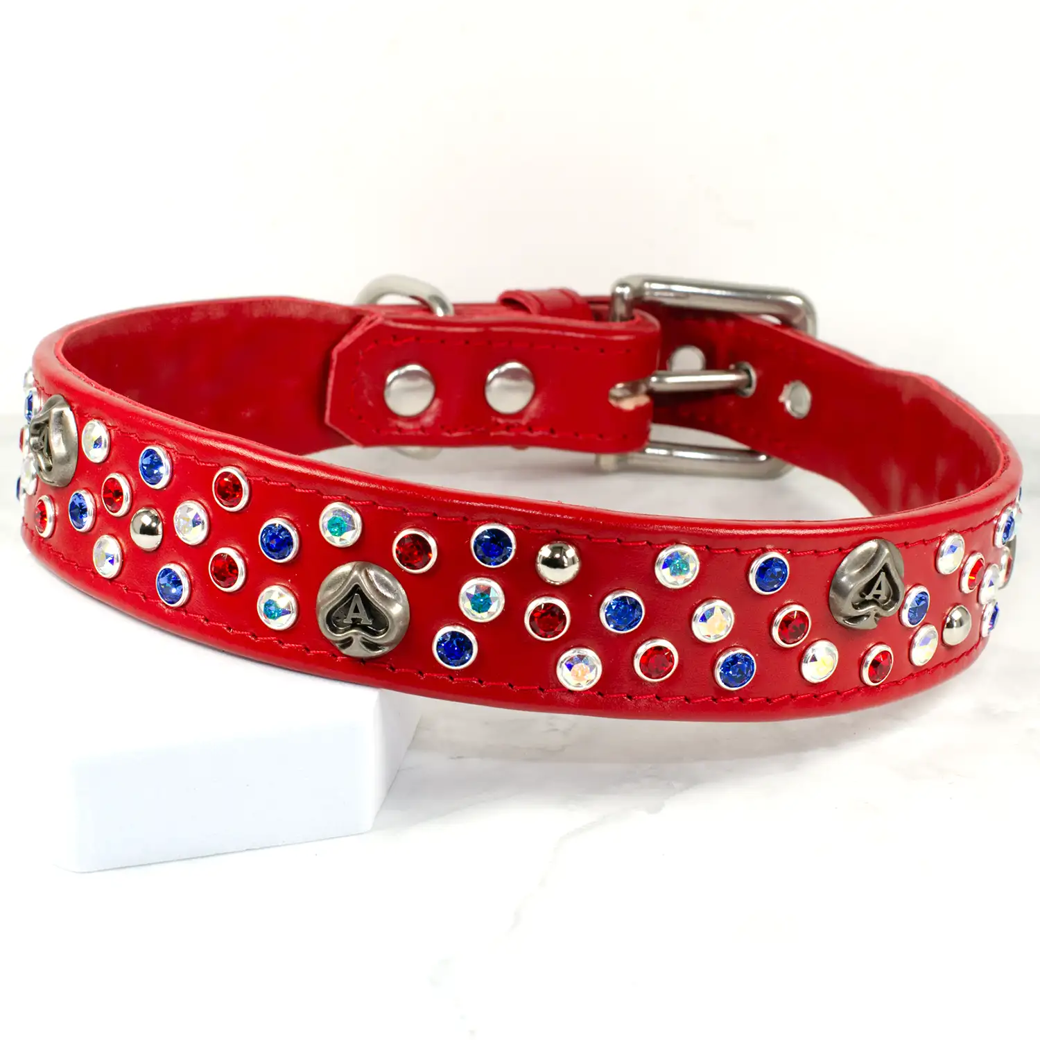 The Jackpot is a unique dog collar with a design that mixes crystals and studs for a bold, playful look. Handmade from Italian calf leather in your choice of 28 colours, it’s finished with Swarovski crystals in up to three sparkling shades, paired with ace of spades and silver dome studs.