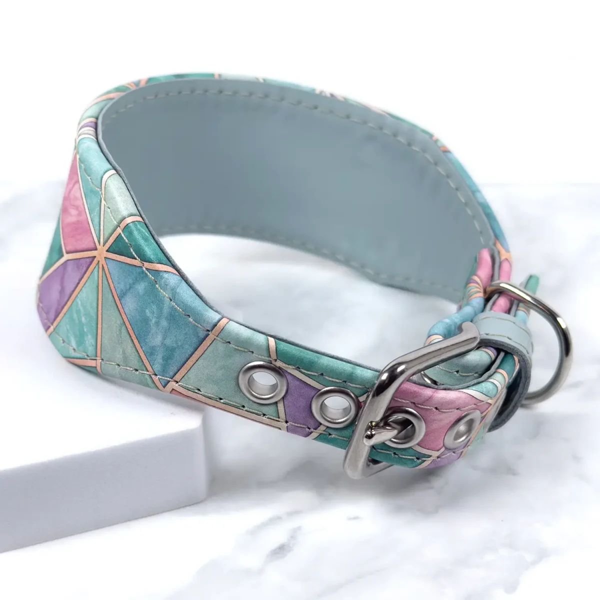 With soft seafoam, teal and powder blue panels, warmed with blush pink and lilac, the Pastel Prism Printed Leather Sighthound Collar is inspired by stained glass geometry. Fine metallic lines break the design into crisp shapes, creating a clean, modern pattern with a gentle pastel palette.