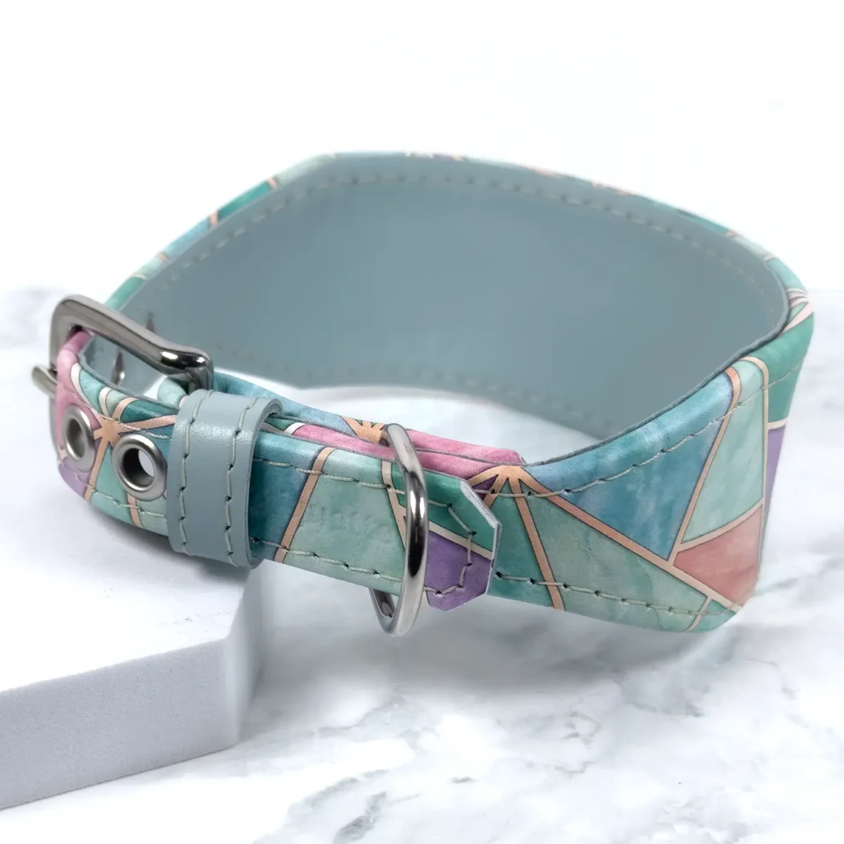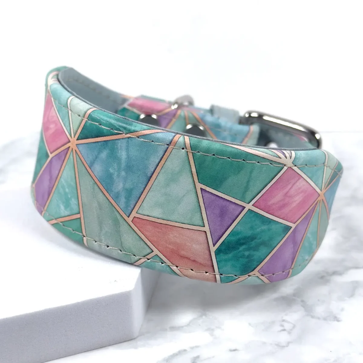 Pastel Prism geometric pastel print on leather, UV printed and handmade in our UK workshop in sizes to fit all sighthound breeds.