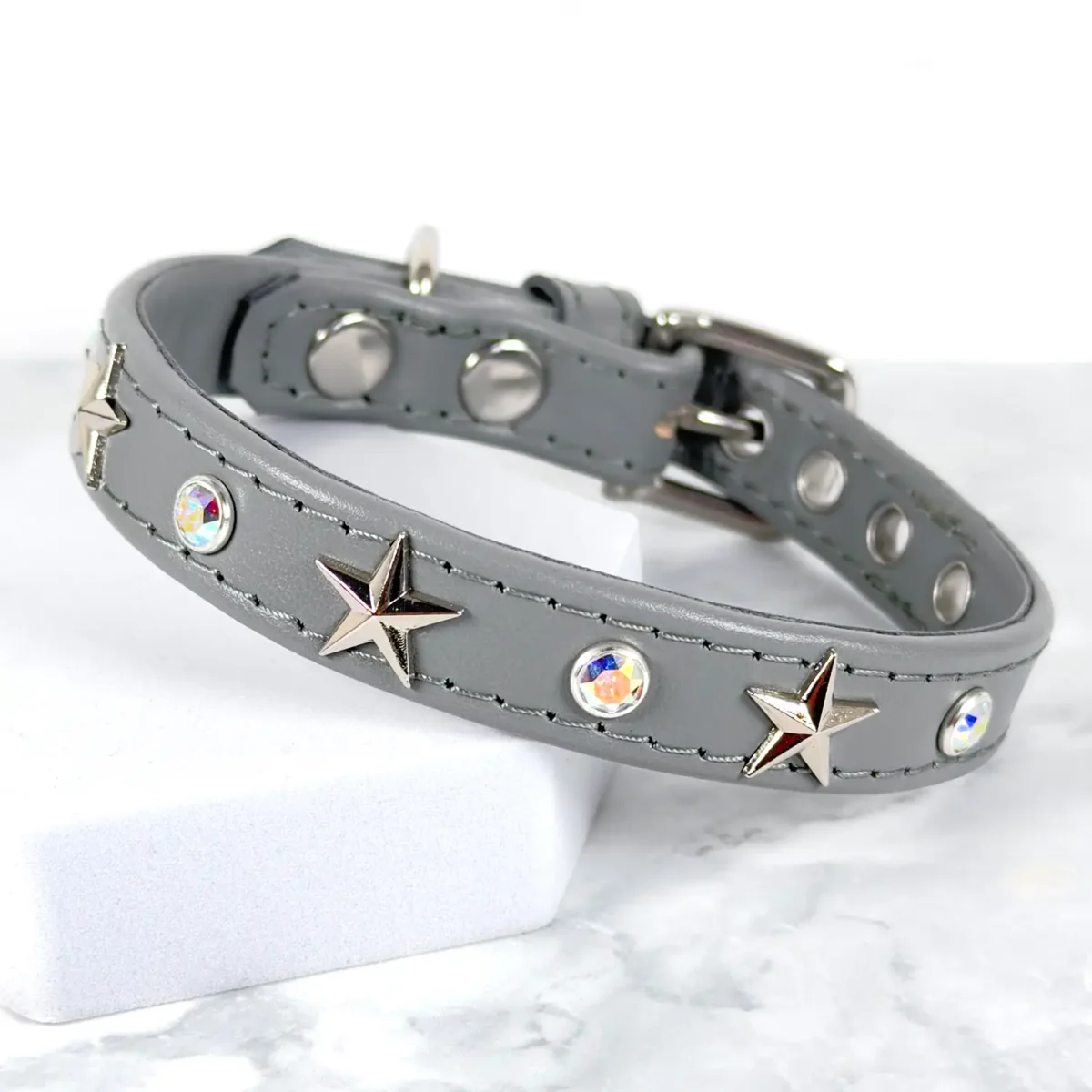Crystal is a clear, bright stone that catches the light cleanly and works beautifully against any leather colour. Crystal AB has a special iridescent coating that shifts colour depending on the angle and the light around it, picking up whatever shade is nearby. Both are stunning, and both are available as the large stone on your collar. If you’re torn, drop us a message and we’ll help you choose based on your leather colour.