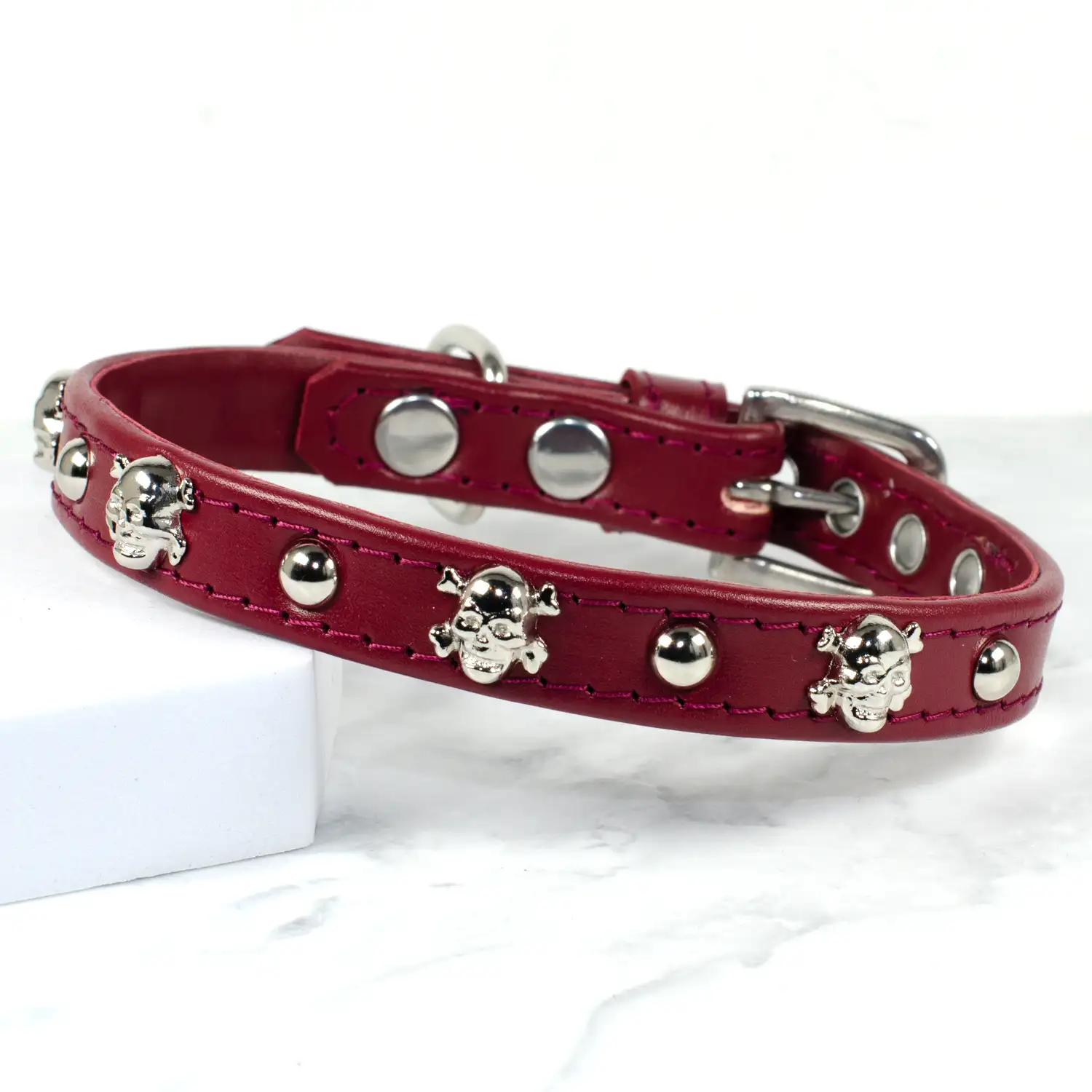 This skull studded leather dog collar is handmade from soft Italian leather and finished with durable stainless steel hardware. The skull studs are securely riveted into the surface, creating a bold, tough-looking design that holds its shape with everyday use.