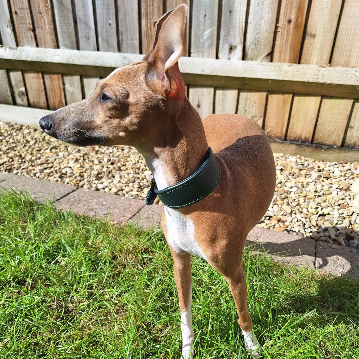 Whippets have slim necks and heads that are narrower than their necks, which makes it easy for a normal flat collar to slip off. A Whippet collar has a wider section at the front, often called a fishtail shape, which spreads pressure evenly and keeps your dog safe without discomfort. The tapered ends sit neatly behind the ears so the collar stays in place. You can learn more in our guide to Whippet collars.